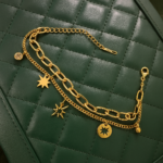 | Double-layered gold anklet with starry charms for a cosmic touch of elegance. |
