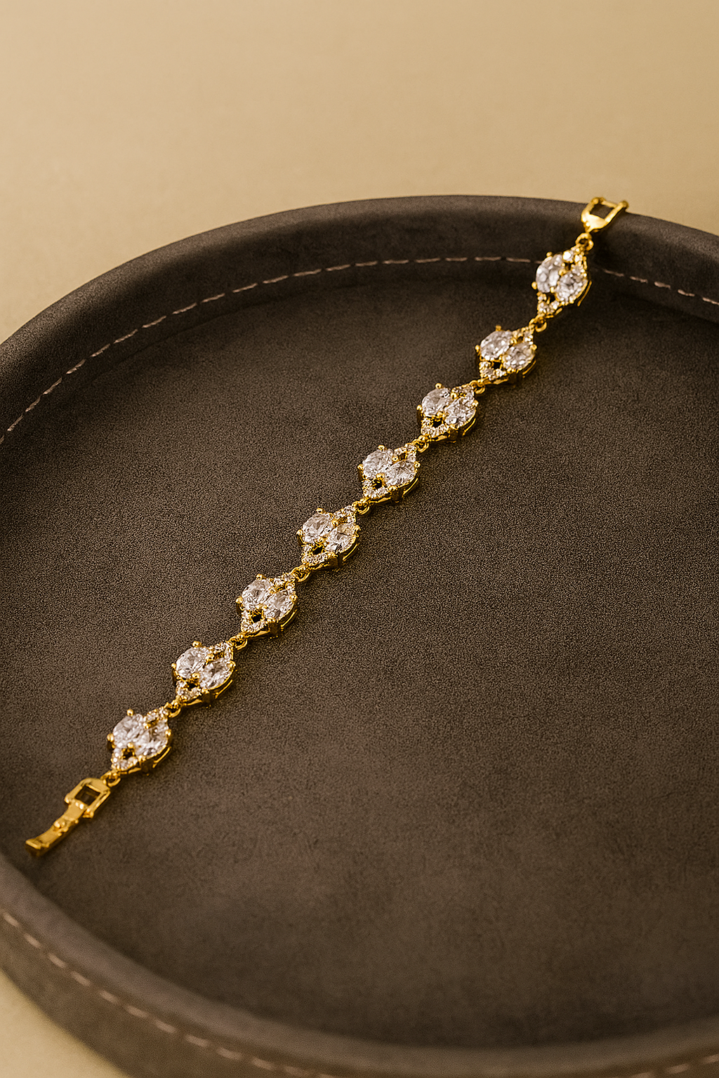 | Tarnish-free gold bracelet featuring petal-shaped zircon clusters for a sparkling floral finish. |