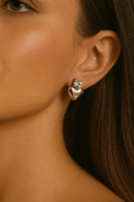 | Shiny silver heart drops paired with a radiant crystal stud for a sleek romantic vibe. |